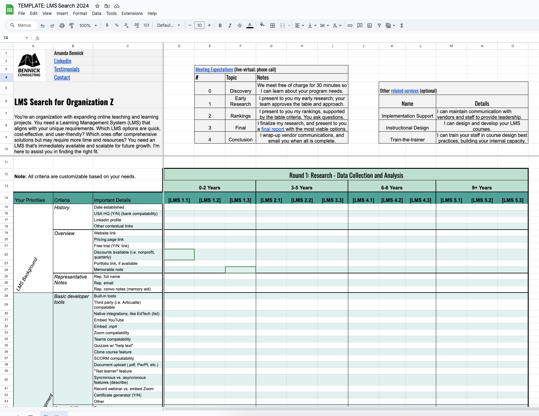 Tools Used: Google Sheets for organizing data, as well as various LMS platforms and their demos for evaluation.