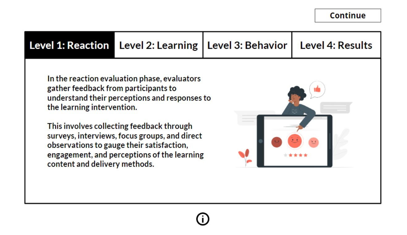 Tools Used: Kirkpatrick’s Four Levels of Training Evaluation, Google Docs, ChatGPT, Articulate Storyline, storyset.com, freepik.com, Adobe Illustrator, AWS3.